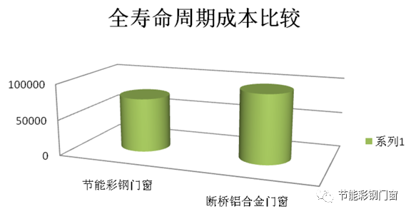 节能彩钢门窗全寿命周期成本与断桥铝合金全寿命周期成本比较只相当于断桥铝合金的 78.89%,较铝合金更经济,更符合节能和低碳的原则。如图二所示: